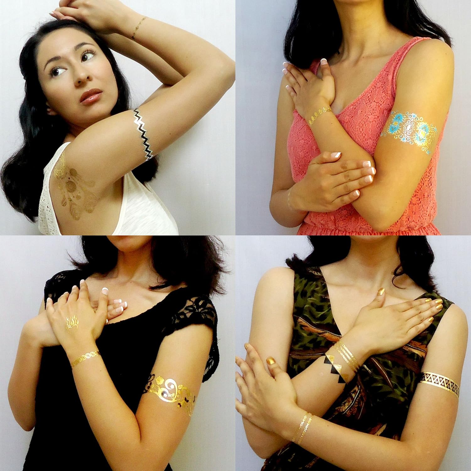 BellEsentials Sexy Temporary Tattoos Set is a set of six temporary tattoo paper sheets with a mix of large and small metallic tattoo designs. They include silver and gold styles with a glitter finish. Among these tattoos are peacock feather plumes, star shapes, wings and more. I had the opportunity to receive this set of tattoos in return for my unbiased review. BellEsentials Sexy Temporary Tattoos are a very stylish variety of tattoos. These are easy to apply and can last for up to 5 days. I have enjoyed putting these tattoos on my wrists and ankles. They definitely add a sexy flair to summer outfits. These are high quality and won't wash off easily. Great for looking cute while avoiding the pain and permanency of a real tattoo. I highly recommend. You can check out more about BellEsentials Sexy Temporary Tattoos Set @ http://www.amazon.com/Temporary-Tattoos-Adult-Women-Teens/dp/B00Y9KVL5K/ref=sr_1_1?ie=UTF8&qid=1435444965&sr=8-1&keywords=BellEsentials+Sexy+Temporary+Tattoos+Set.
